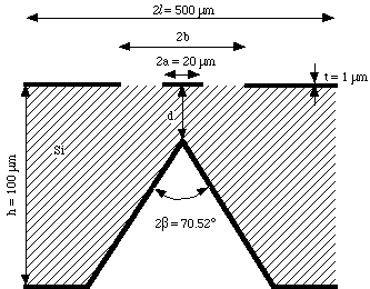 Figure 1: (a) V-shaped conductor-backed coplanar waveguide (VGCPW); the angle corresponds to an anisotropically etched groove in (100) Si. (b) CPW gap (b - a) as a function of the V-groove distance d for a constant Zo = 50 [Omega] design; dotted line : distance d = 16 um for a 50 [Omega] V-groove microstrip line (i.e., no CPW ground planes).